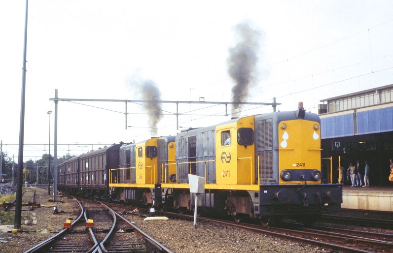 Laatste dag van inzet van diesellocomotieven serie 2400 in de buurtgoederentrein van Amersfoort naar Naarden-Bussum. De locomotieven 2411 en 2456 duwen de lege wagens van Bensdorp op spoor 5 tot over de overweg Comeniuslaan om daarna de VAMwagens in Crailoo op te halen; 26 mei 1989. De 2411 is voor de gelegenheid door een lokale hobbyist voorzien van traantjes. Foto: Martijn de Vries.