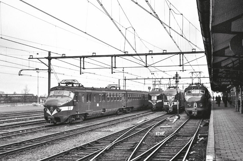 Stroomlijnmaterieel in Alkmaar op 15 januari 1961. Van links naar rechts de treinstellen 761, 809, 652 en 738. Foto: L.J.P. Albers.