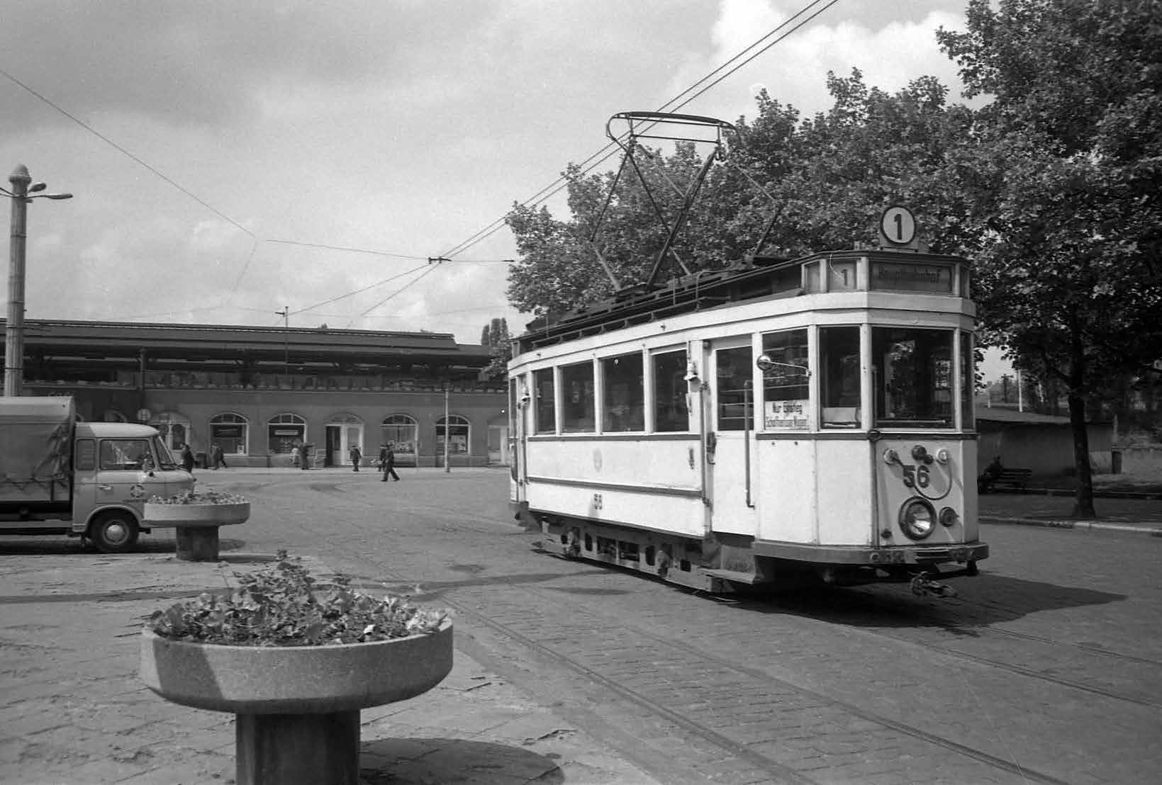 Frankfurt Oder, Bahnhofsplatz met Wismartram 56 op de korte stationslijn 1; 14 juni 1967.