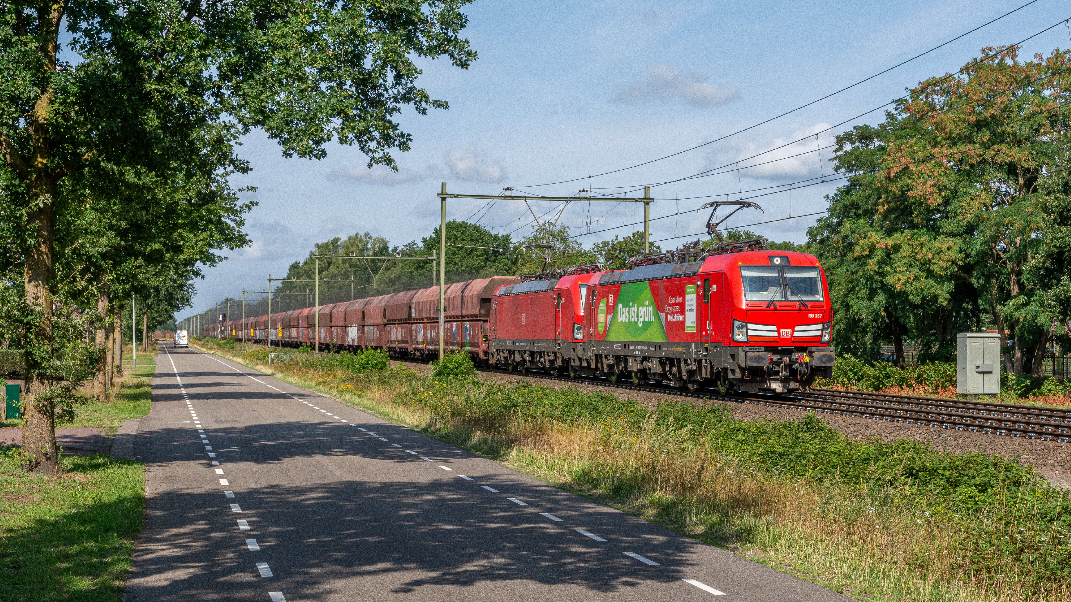 DB Cargo zet naast locomotieven serie 189 ook Vectrons in voorspan in. Op 6 augustus 2019 reden de 193 357 en 347 met kolentrein bij America op weg naar Venlo. Foto: Rob Dammers.