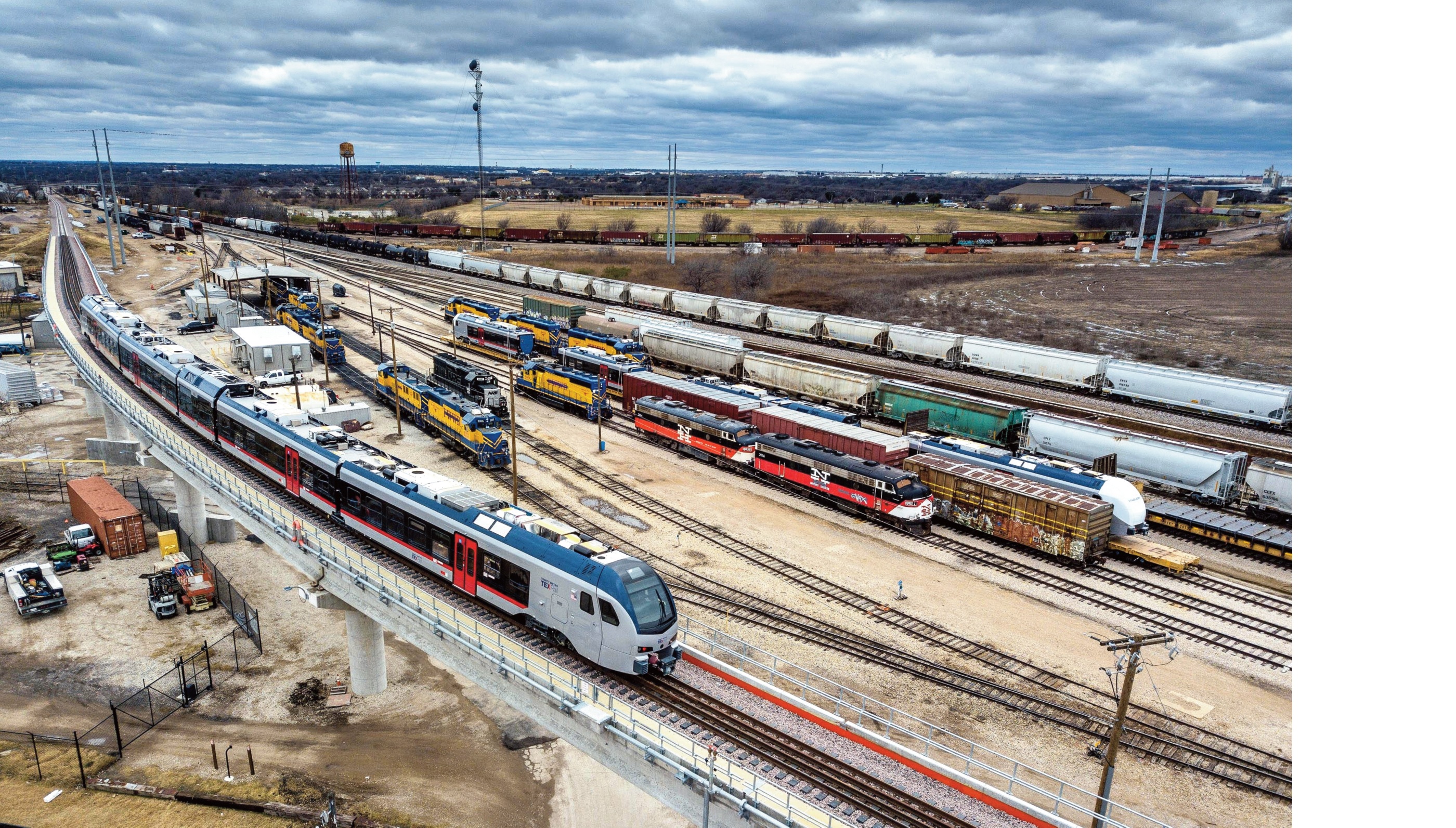 Een treinstel van TEXRail arriveert op het oude emplacement van de Cotton Belt ‘Hodge Yard’, aan de noordkant van Fort Worth; 12 januari 2019. Foto: Blair Kooistra.