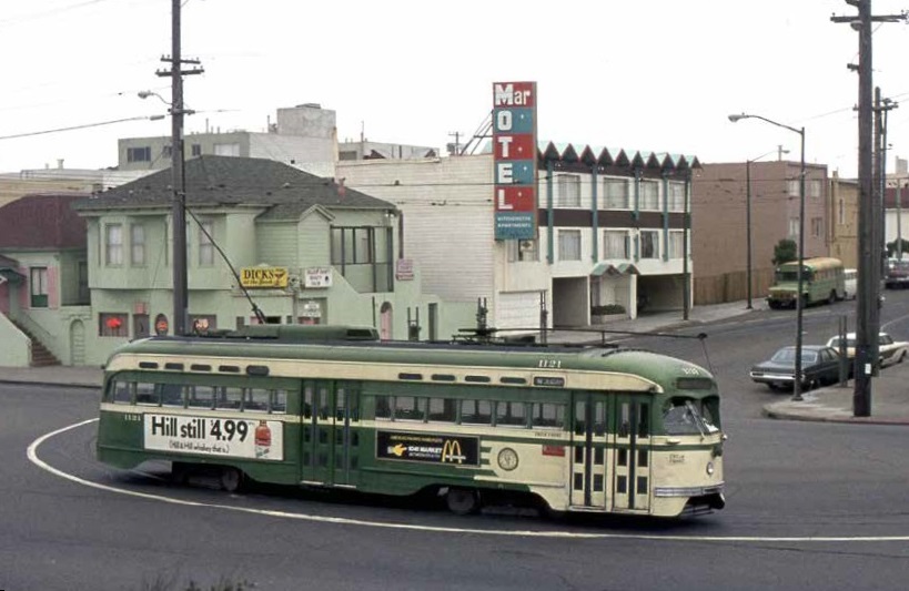 San Francisco PCCcar 1121 van de maatschappij SFMR in de keerlus van het eindpunt Judah van lijn N; 21 maart 1972. Foto: Ciril van Hattum.