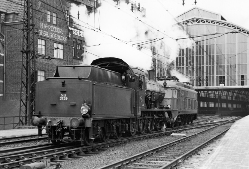 Een beeld dat veel stoomliefhebbers indertijd (en misschien nu nog) met enig genoegen zullen bekijken. De 3759 sleept de defecte 1002 naar de werkplaats. Amsterdam CS, 6 maart 1954. Foto L.J.P. Albers.