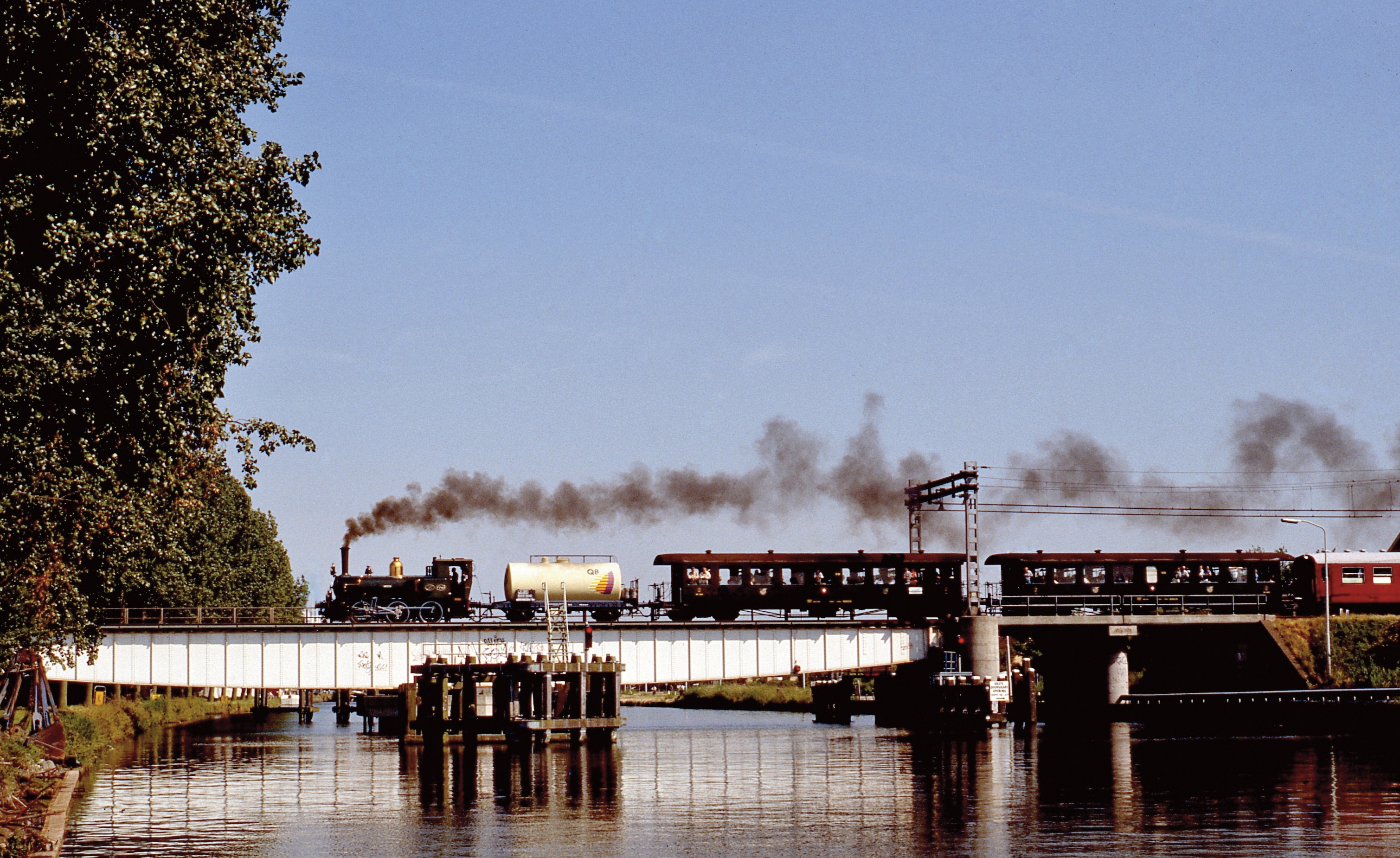 NS 7742, onderweg van Hoorn naar Utrecht, steekt via de toenmalige oude draaibrug het Noord-Hollands Kanaal bij Purmerend over. Rechts de onderdoorgang van de in 1949 opgeheven NZH-tram. Vrijwel het gehele traject werd op eigen kracht gereden. Alleen op het traject van Zaandam door de Hemtunnel naar Amsterdam kreeg de trein assistentie van diesellocomotief 2212. 17 juni 1989. Foto: Remmo Statius Muller.
