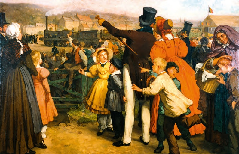 Feestelijke opening van de spoorlijn Brussel-Mechelen op 5 mei 1835; de eerste spoorlijn in België en op het Europese vasteland. Originele titel: ‘Le départ de la Flèche’. Schilderij van Jan Antoon Neuhuys uit 1885.