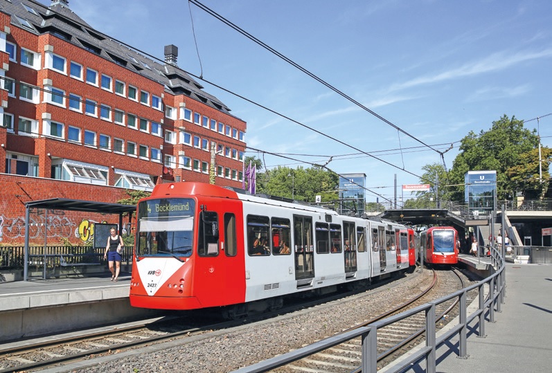Twee gemoderniseerde Stadtbahn B-stellen in de halte Severinstrasse; 4 augustus 2018. Ondergronds eindigt hier het zuidelijke deel van de Nord-Süd Stadtbahn.