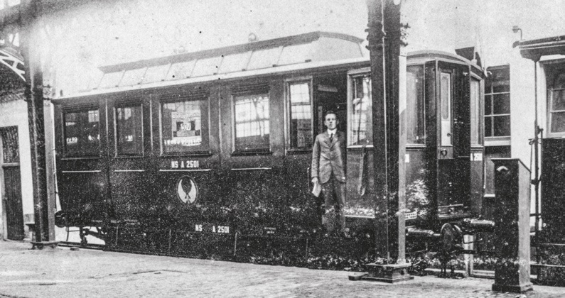 SOV-informatierijtuig NS A 2501, Utrecht Maliebaanstation, ca. 1924,met poserend P.C. Lagas (penningmeester en bestuurslid hoofdbestuur SOV).