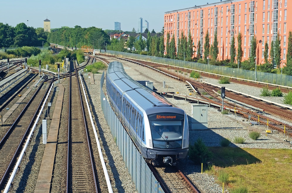 Een van de nieuwe metrostellen van het type C2 rijdt op lijn U6 en nadert station Fröttmaning. Dit was toen het enige traject waarop dit materieel was toegelaten; 20 juli 2016.