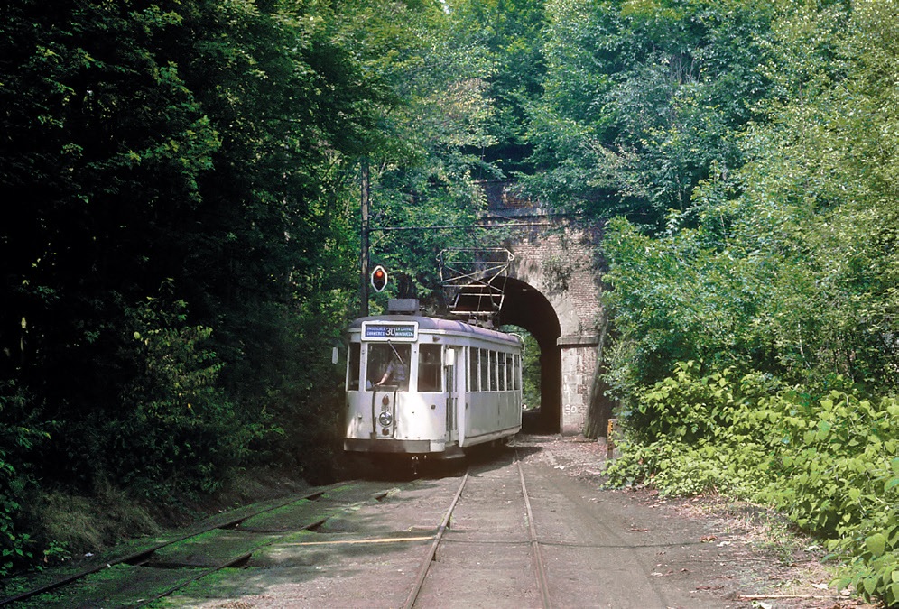 S-motorwagen 9051 tussen Mariemont en Morlanwelz bij het tunneltje onder spoorlijn 112 (La Louvière – Marchienneau-Pont) en de daaraan parallel lopende tramlijn 80, waarvan lijn 30 zojuist is afgetakt; mei 1980.
