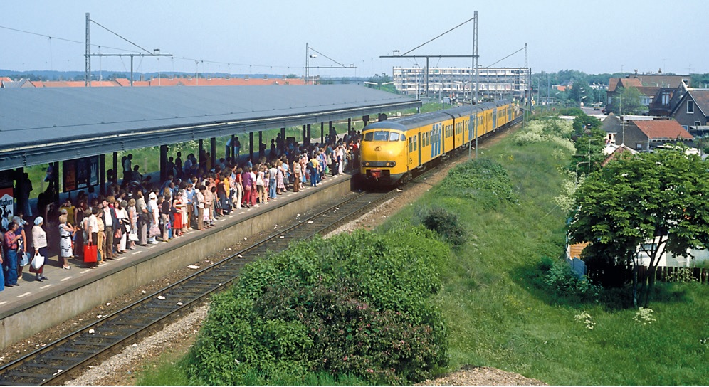 Huiswaarts kerende strandgangers verwelkomen op station Zandvoort een extra trein bestaande uit een treinstel Plan T, zomer 1979.