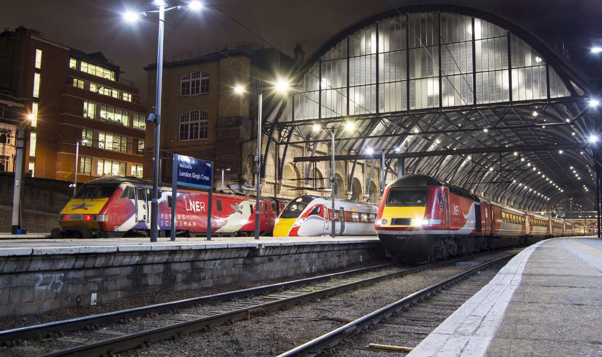 Drie materieelsoorten van LNER onder de kap van London King’s Cross op 18 november 2019. Van links naar rechts class 91-locomotief 91101 met bestemming Leeds, class 800-treinstel 800205 naar Newark en class 43-motorwagen 43277