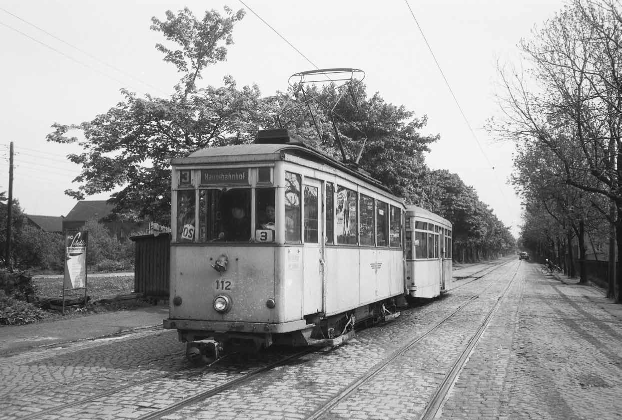 Zwickau, vooroorlogs tramstel met middeninstap-bijwagen 212 op het buitentraject van lijn 3 in Cainsdorf; 19 mei 1968. Foto: Maurits van Witsen.