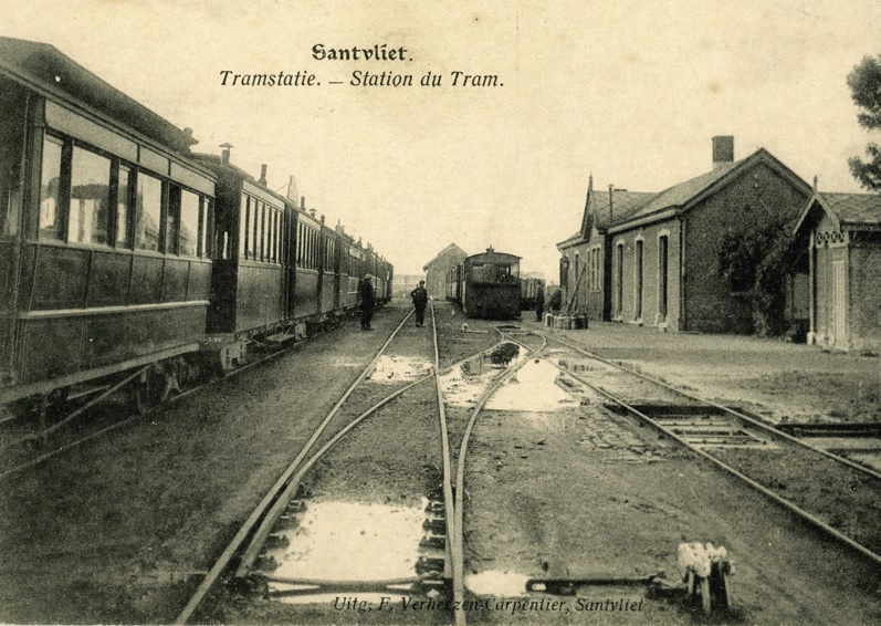 Een lange tram naar Zandvliet Grens in station Zandvliet Tol begin jaren twintig. Van links naar rechts een Beijnes-rijtuig, vierasser B.1403, een De Rechter-rijtuig, nog een Beijnes-rijtuig en nog enkele rijtuigen. Ze zijn smaller dan de locomotief vooraan. Foto: verzameling auteur.