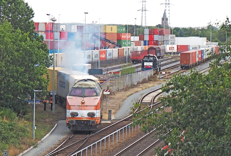Cabooter is een grote pleitbezorger van het railgoederenverkeer met een terminal in Blerick, een in Kaldenkirchen en een in aanbouw ten westen van Blerick. De losplaats in Blerick heeft het uiterlijk van een containerterminal sinds RFO dagelijks een containershuttle naar de APM-II terminal in de Maasvlakte rijdt. Locomotief 6702 (ex-Locon 9802) verzorgt het rangeerwerk. In de verte staat RFO 7110 die de trein later naar Venlo zal trekken; 17 september 2019. Foto: Rudi Liebrand.