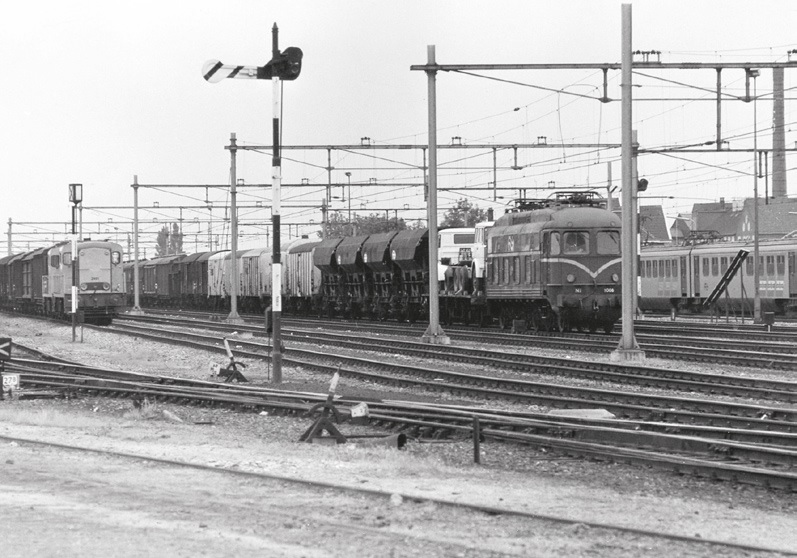 Het noordelijke gedeelte van het emplacement van Elst met diesellocomotief 2461 op spoor 13 en elektrische locomotief 1008 op spoor 10, met bestemming Amsterdam; 26 mei 1974. Foto: W. Vos.