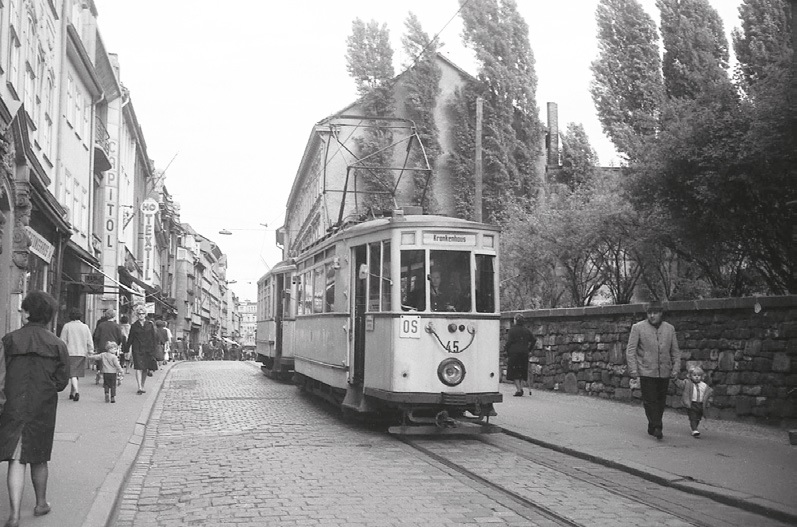 Het vooroorlogse tramstel 45 + 35 rijdt in Eisenach door het centrum via de linkerzijde van de Karlstrasse;