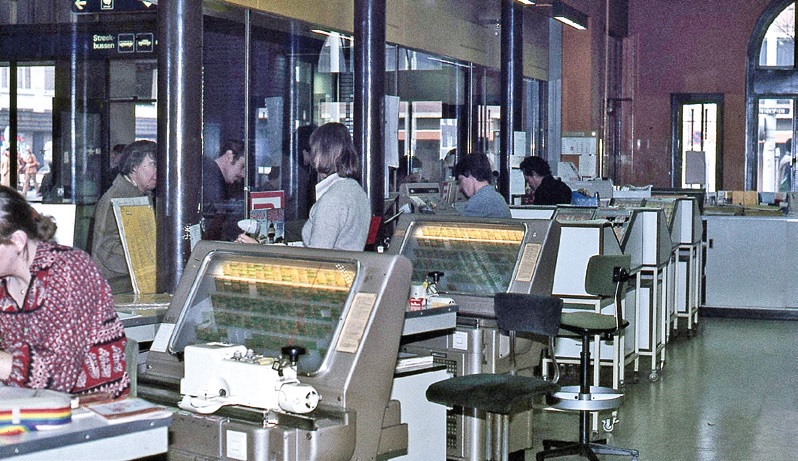 Plaatskaartenkantoor met grote AEGmachines in station Den Haag HS; 1979. Foto: Bert van der Kruk.