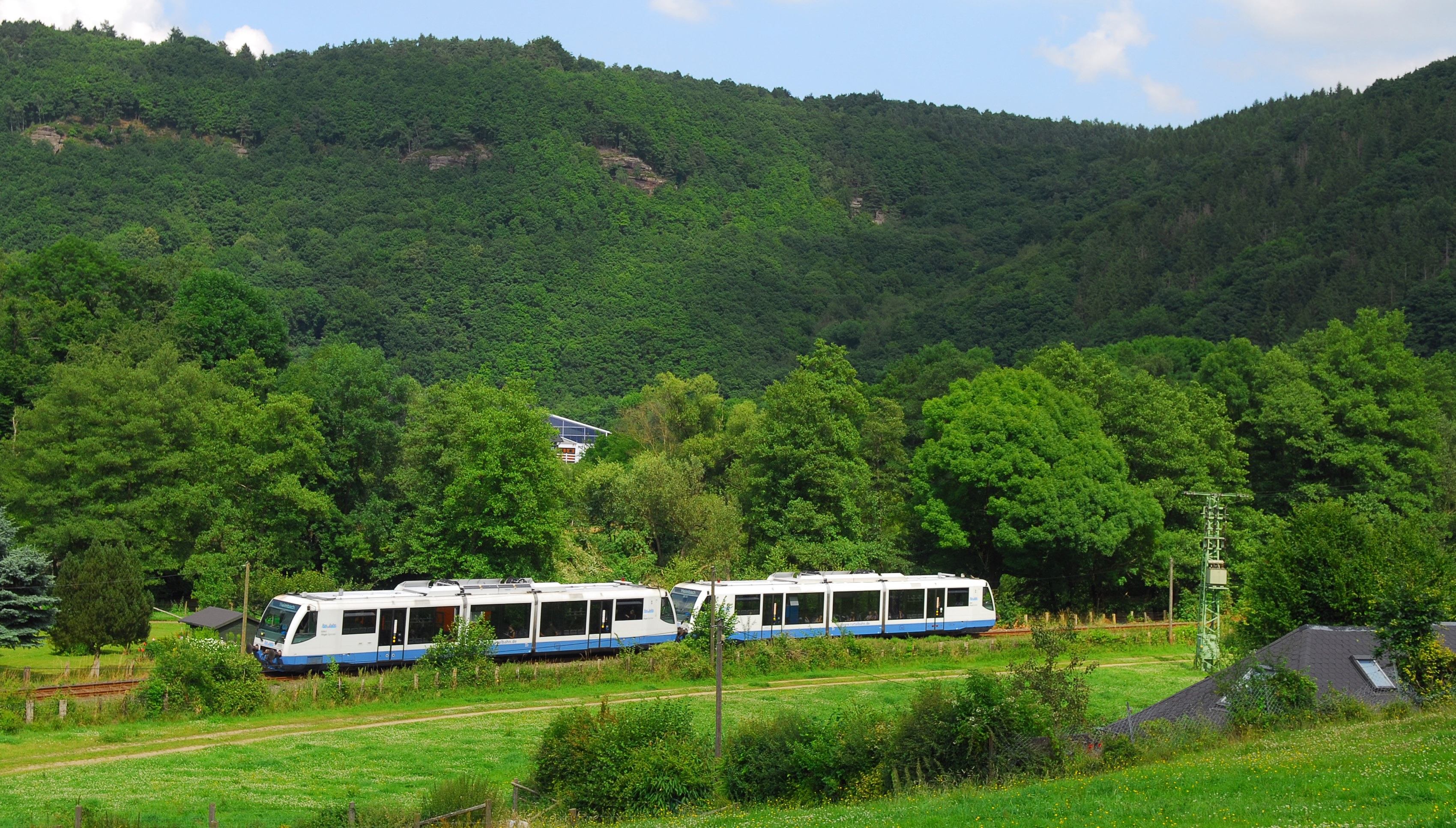 De RegioSprinters waren vele jaren het gezicht van de Dürener Kreisbahn. Op 7 april 2009 zijn twee treinstellen bij Zerkall onderweg naar Heimbach. Foto: Frans Blanker-Halstein.