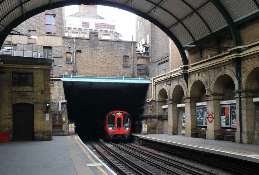 In Paddington Station is de cut-and-covermethode nog te zien, inclusief de open ruimte om rook uit de tunnels weg te houden. Een S-type (21563) op de Circle line rijdt het station binnen op 30 mei 2018. Foto: Erwin Voorhaar.