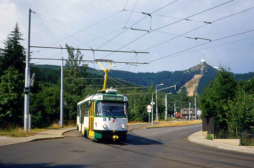 Sinds 2005 is het eindpunt Horní Hanychov weer per tram bereikbaar, nu op normaalspoor. De 45 van lijn 3 op de Ješt?dska met de Ješt?d op de achtergrond; 23 juli 2006. Foto: Ciril van Hattum.