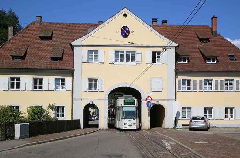 Een bekend fotomotief en dat al sinds 1901: het poortgebouw dat de toegang vormt tot Günterstal. Vanwege het kopeindpunt met een kort halteperron kan op dit traject alleen tweerichtingmaterieel