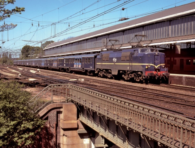 NS-locomotief 1201 loopt binnen op spoor 3 van station Haarlem met de intercity van Zandvoort naar Maastricht, bestaande uit acht Plan E-rijtuigen; omstreeks 1980.