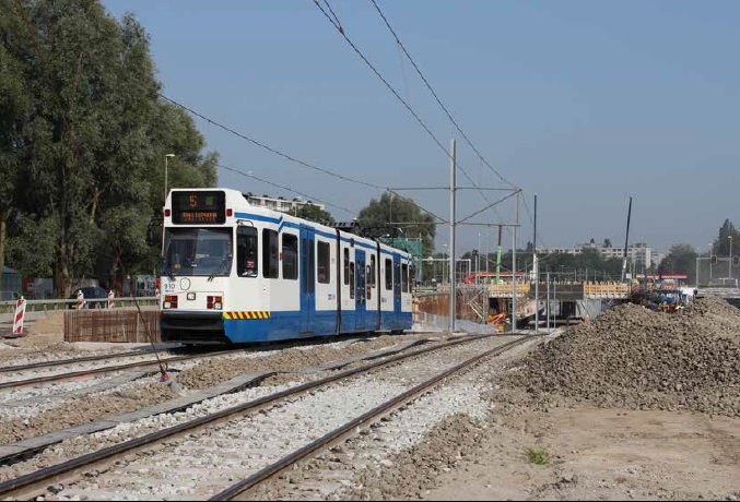 De 905 op lijn 5 passeert na de zomerbuitendienststelling van 2019 de nieuwe onderdoorgang Kronenburg die alleen nog in ruwbouw klaar is. Het BN-materieel wordt dit voorjaar vervangen door de blauw-witte CAF-trams; 27 augustus 2019.