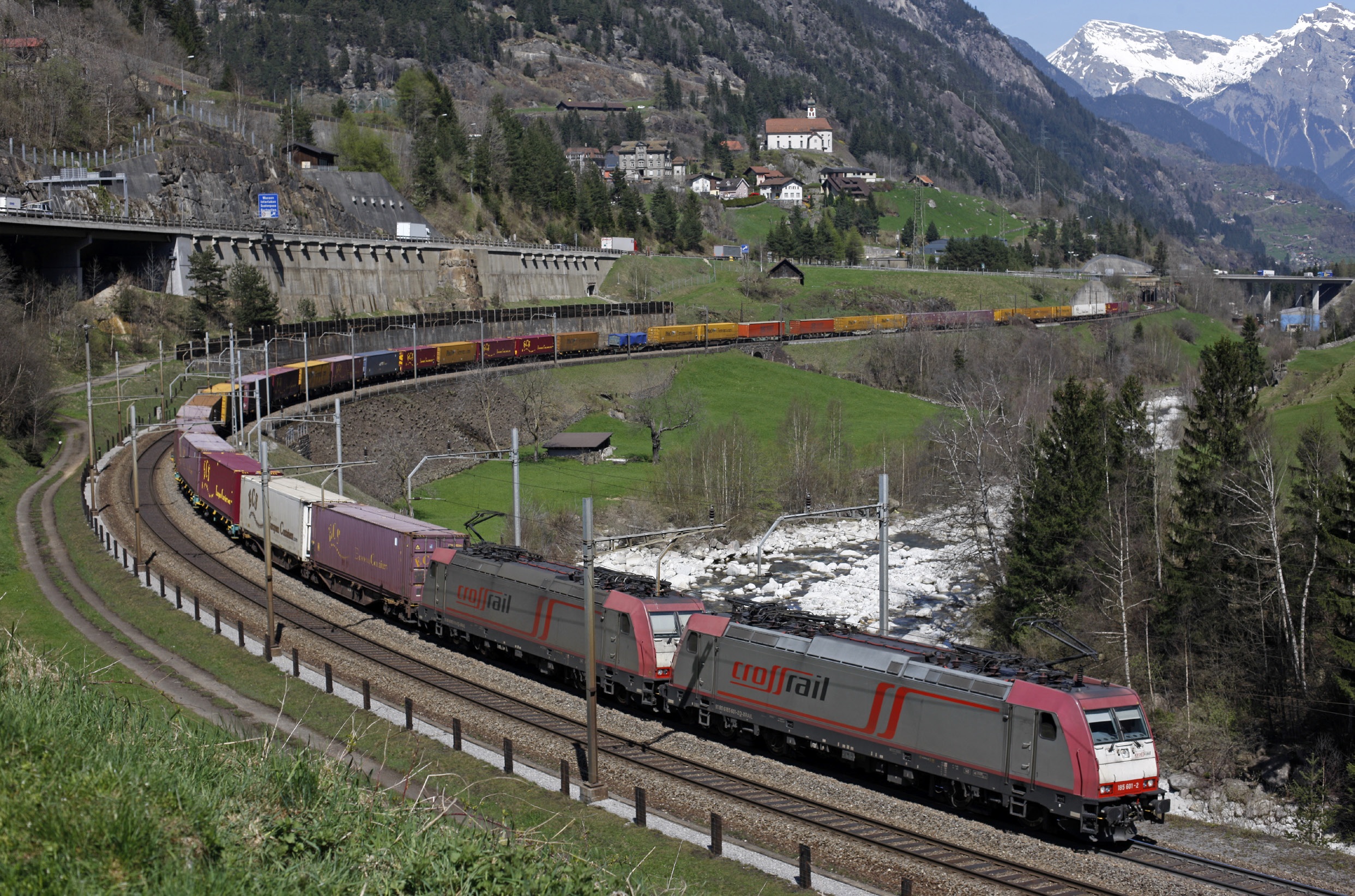 Op 21 april 2015 trekken twee door Crossrail Benelux N.V. van Beacon Rail Leasing geleasete elektrische Bombardier Traxx F140 AC2-locomotieven containertrein 40125 (Zeebrugge – Milano Smistamento) over het klassieke Gotthardtraject bij Wassen.
