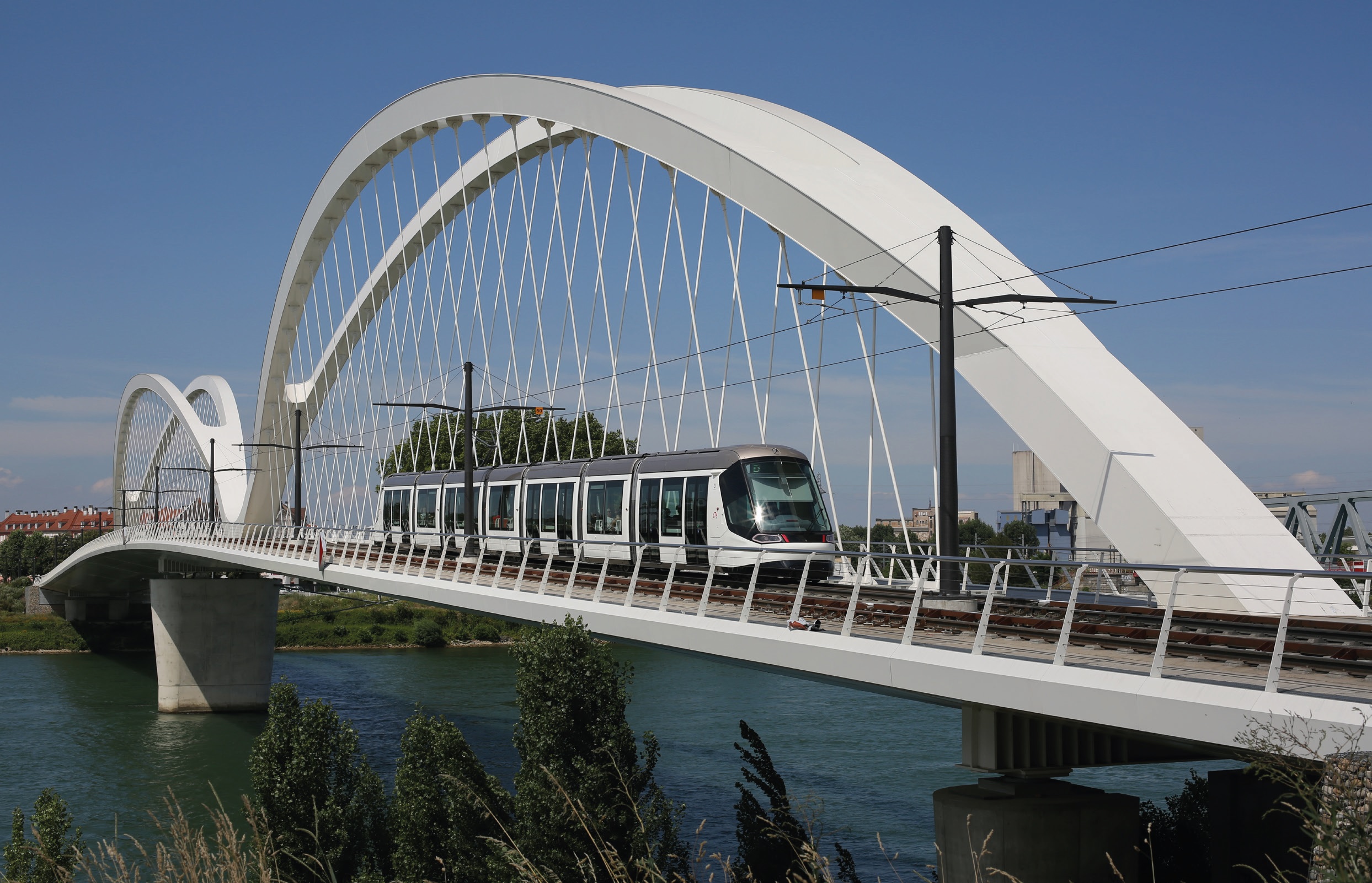 De brug over de Rijn voor trams, fietsers en voetgangers tussen Frankrijk en Duitsland, zowel Pont Beatus Rhenanus als Beatus Rhenanus Brücke genaamd, met een tram onderweg tussen
