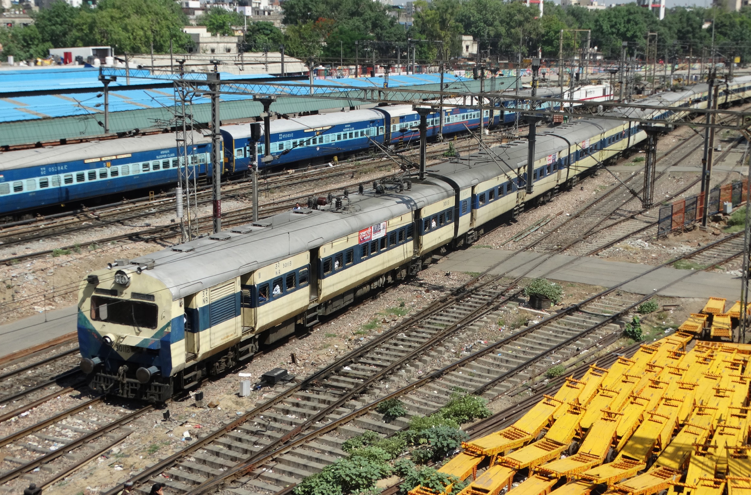 Het lokale transport binnen de metropool Delhi wordt verzorgd door de Delhi Suburban Railway en maakt gebruik van dezelfde sporen als de langeafstandstreinen. De stellen bestaan altijd uit twaalf rijtuigen waarvan een tweetal exclusief voor vrouwelijke reizigers; 25 mei 2019.
