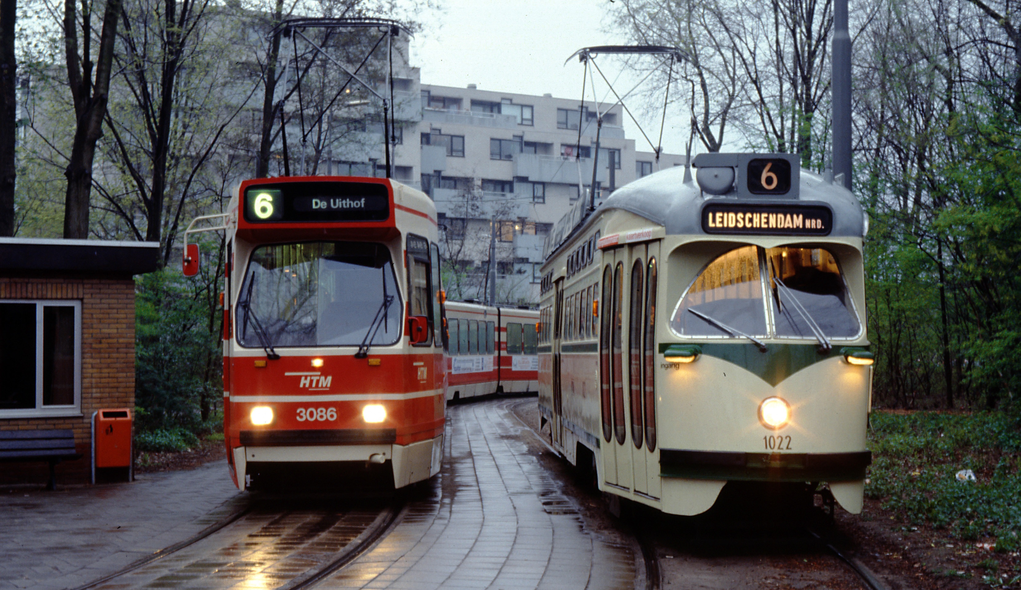De eindlus in Leidschendam Noord op 8 april 1991, met de 3086 van lijn 6 en excursietram 1022, ingezet bij een eerder 50-jarig bestaan: dat van de NVBS-afdeling Den Haag.