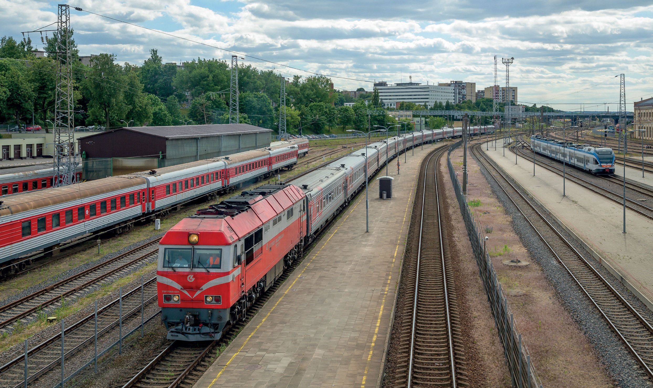 Locomotief TEP70BS-804 van de Lietuvos geležinkeliai (Litouwse Spoorwegen) rijdt op 7 juni 2018, met vijftien rijtuigen aan de haak, station Vilnius binnen met een doorgaande trein van Kaliningrad naar Sint Petersburg. Een locomotief van de Wit-Russische spoorwegen zal transittrein D 80 overnemen om deze opnieuw over de grens te brengen. In Vilnius vindt voor in- en uitstappende reizigers grenscontrole plaats. De twee perronsporen worden geflankeerd door moderne met prikkeldraad uitgeruste hekwerken en het aantal bewakingscamera’s is nauwelijks te tellen.