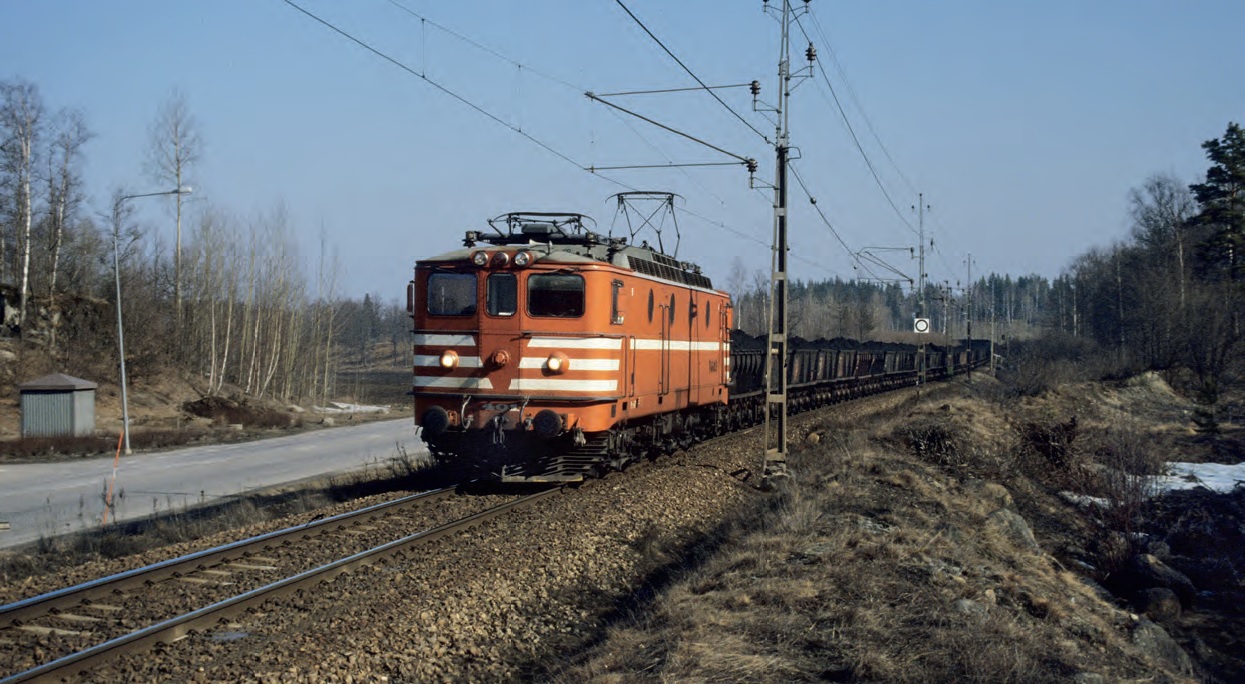 Elektrische locomotief Ma 401 met een beladen ertstrein van Grängesberg naar Oxelösund bij Flensövre op 4 april 1987.