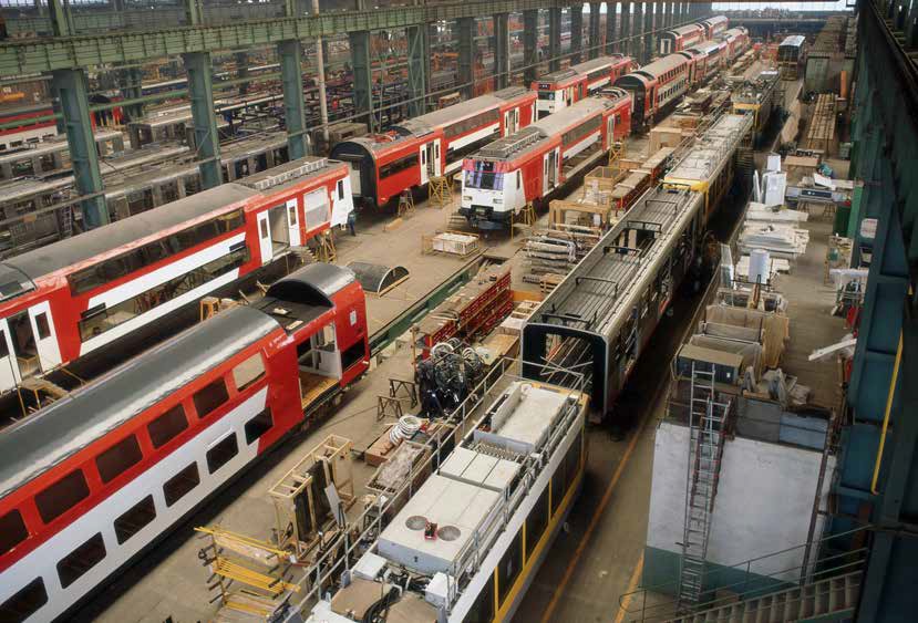 De fabriekshal van CAF in 1994. Prominent in beeld een serie dubbeldekkers voor de Cercanías rond Madrid. Op de voorgrond staan lagevloertrams voor Lissabon en een metrorijtuig voor Bilbao.