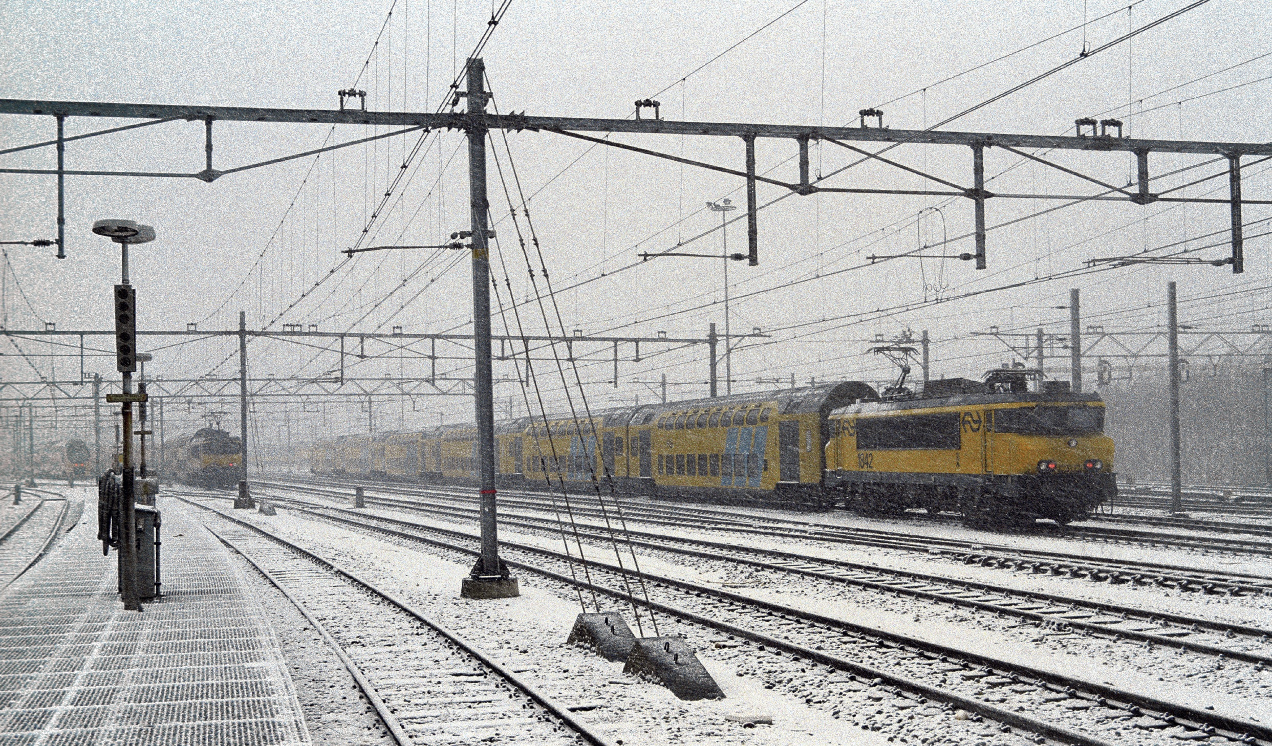 Een van de opstel terreinen voor Amsterdam Centraal ligt naast de voormalige lijnwerkplaats Zaanstraat. In winterse omstandigheden in februari 2007 staat hier onder andere DDM-1 als spitsmaterieel opgesteld.