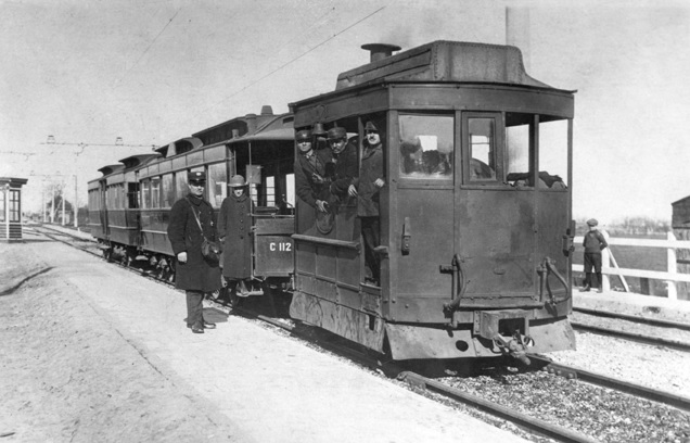 Locomotief NS 2 (Merryweather 88/1879, ex-SS 2, ex-NRS 2) met de personenrijtuigen NS C 112 en NZH B 18 (met middenbalkon) op het reeds geëlektrificeerde emplacement Veur (Leidschendam) van de NZH. Van 25 januari tot 11 april 1924 reden elektrische trams van Leiden tot Veur en normaal spoorstoomtrams (deels met NS-materieel) van Veur tot Den Haag. Daarna was de bovenleiding tot Scheveningen gereed; 1924.