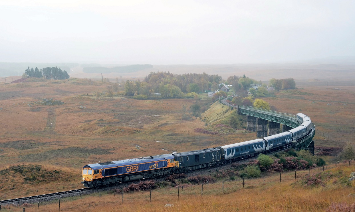 Getrokken door class 66 locomotief 66737 en class 73 locomotief 73967 van GB Railfreight heeft een van de vleugeltreinen van de Caledonian Sleeper nog zo’n zestig kilometer te gaan tot zijn eindbestemming Fort William. De 73967 voert het logo van de slaaptrein en heeft als voornaamste taak de trein van verwarming en stroom te voorzien. Rannoch Station, 25 oktober 2021.