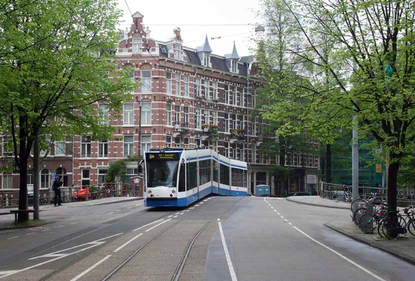 Combinaties van spoorkrommingen in het verticale en horizontale vlak stellen lagevloertrams flink op de proef. In Nederland is de Roetersstraat in Amsterdam het uitdagendste parcours, hier nog als onderdeel van de vroegere lijn 6, met Combino 2149 op de laatste dag van die lijn; 27 mei 2006.