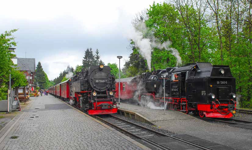 Stoomlocomotieven 99 7240 en 99 7245 van de Harzer Schmalspurbahnen staan op 30 mei 2010 in station Drei Annen Hohne, waar de spoorlijn naar de Brocken aftakt van de Harzquerbahn. In de Harz staan dagelijks locomotieven, gestookt met Poolse steenkool, onder stoom voor het drukke toeristenverkeer.
