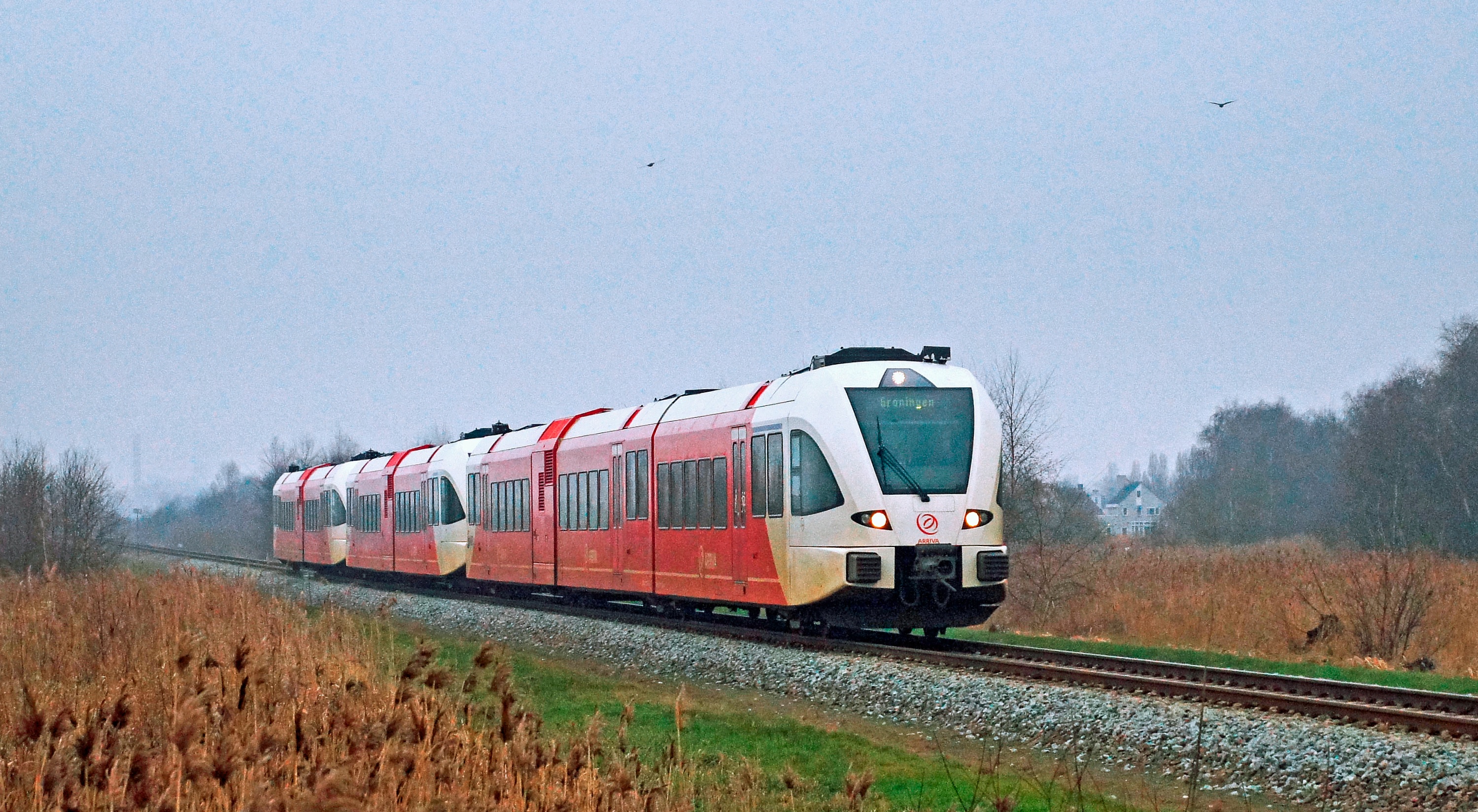 Een vrijdagse spitstrein met GTW-treinstellen 316 + 232 + 238 tussen Leeuwarden en Groningen bij Tytsjerk-Alddiel, 1 februari 2019.