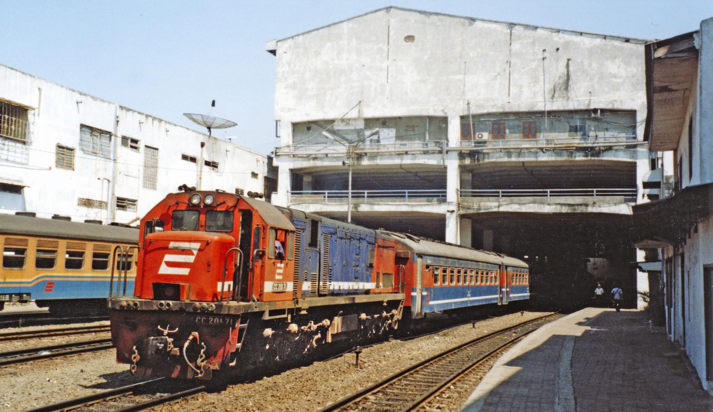 Loc CC201 71 verlaat het stationsgebouw van Surabayakota met een economytrein naar Malang. De serie 201 is in tussen 1977 en 1998 door General Electric gebouwd. Een aantal subseries bestaat uit omgebouwde BB-locomotieven van dezelfde leverancier.