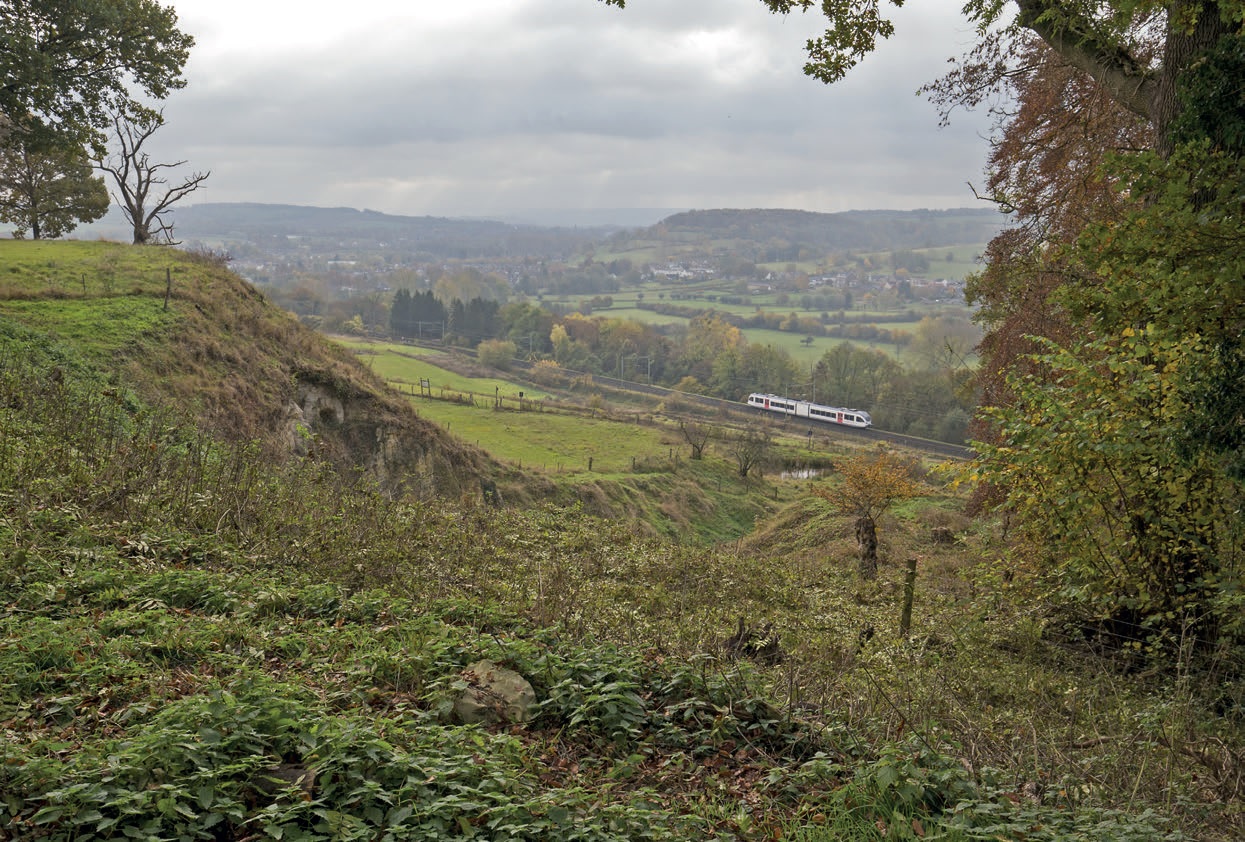 In het heuvellandschap van Zuid-Limburg rijdt een GTW van Veolia van Schin op Geul naar Valkenburg op 6 november 2016.