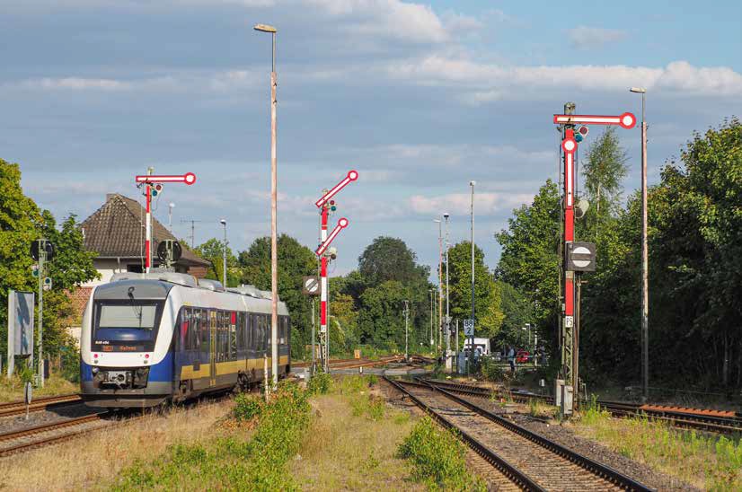 Het station van Soltau heeft nog met trekdraden bediende armseinen. Treinstel 648 494 vertrekt als RB 37 naar Uelzen. Soltau, 7 augustus 2022.