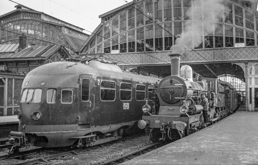Locomotief NS 1827 met reizigerstrein 135 naast een elektrisch treinstel mat ’36 in
