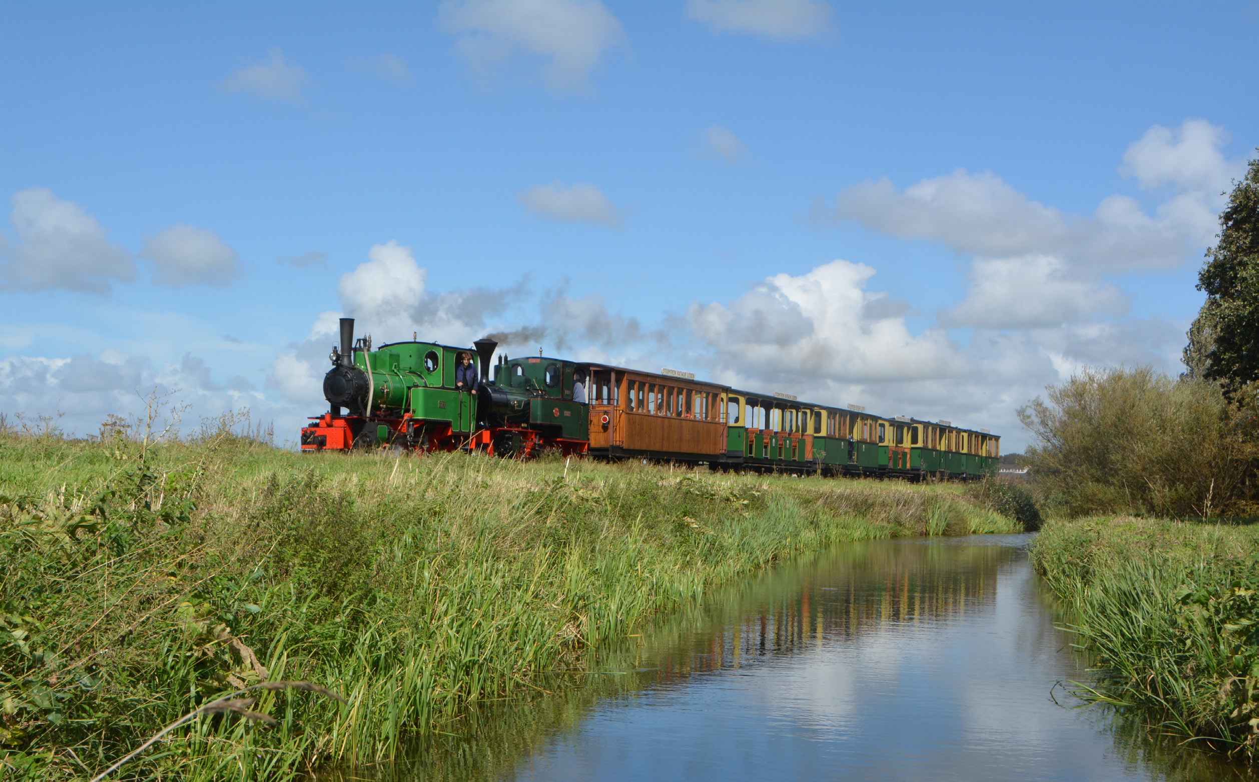 Dubbeltractie langs het Valkenburgse Meer: de locomotieven 8 (Henschel, 1928) en 4 (O&K, 1937) onderweg met een trein. Valkenburg ZH, 29 augustus 2020.