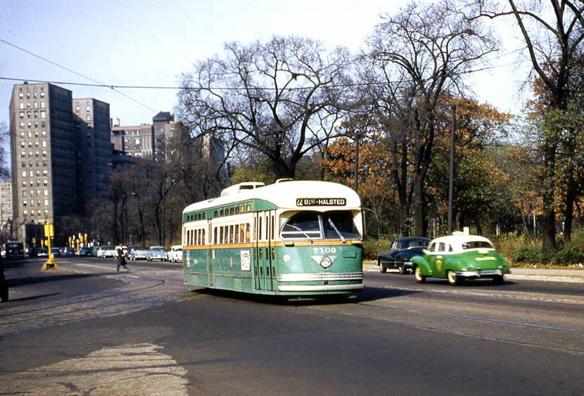 ‘Green Hornet’ 7109 van de CTA in North Clark Street bij het Lincoln Park; 8 november 1953.