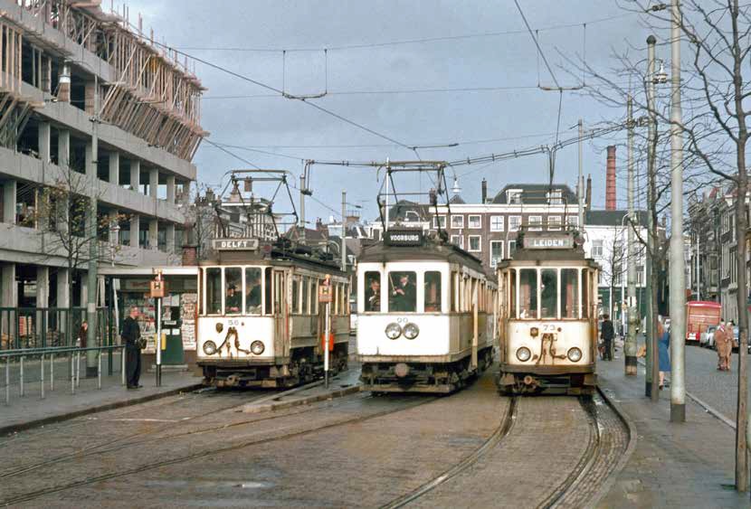 De Turfmarkt met de drie buitenlijnen naar Delft, Voorburg en Leiden; voorjaar 1961. De oude bebouwing is nog grotendeels intact, links is het kantoorgebouw van Lummus in aanbouw.