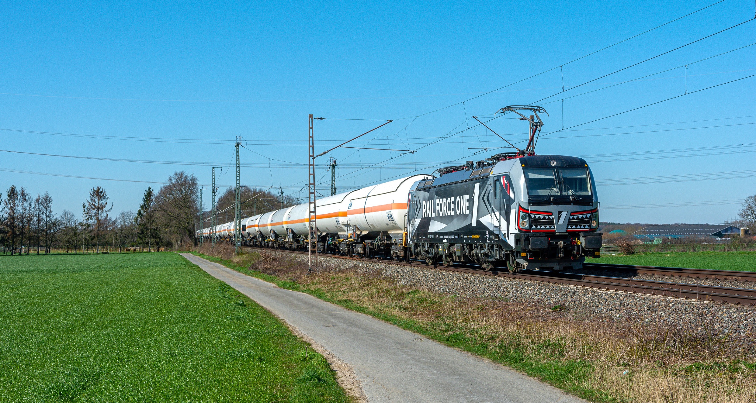 Rail Force One locomotief 193 623 ‘Sharky’ met Nacco gasketelwagens bij Mehrhoog onderweg richting Krefeld-Linn; 23 maart 2020.