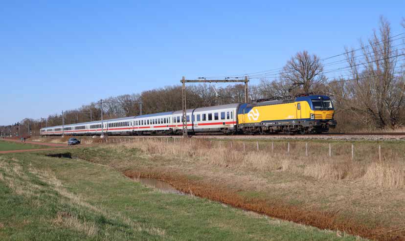 NS-locomotief 193 262 van het type Vectron met de intercity naar Berlijn in Zenderen op 28 februari 2023.