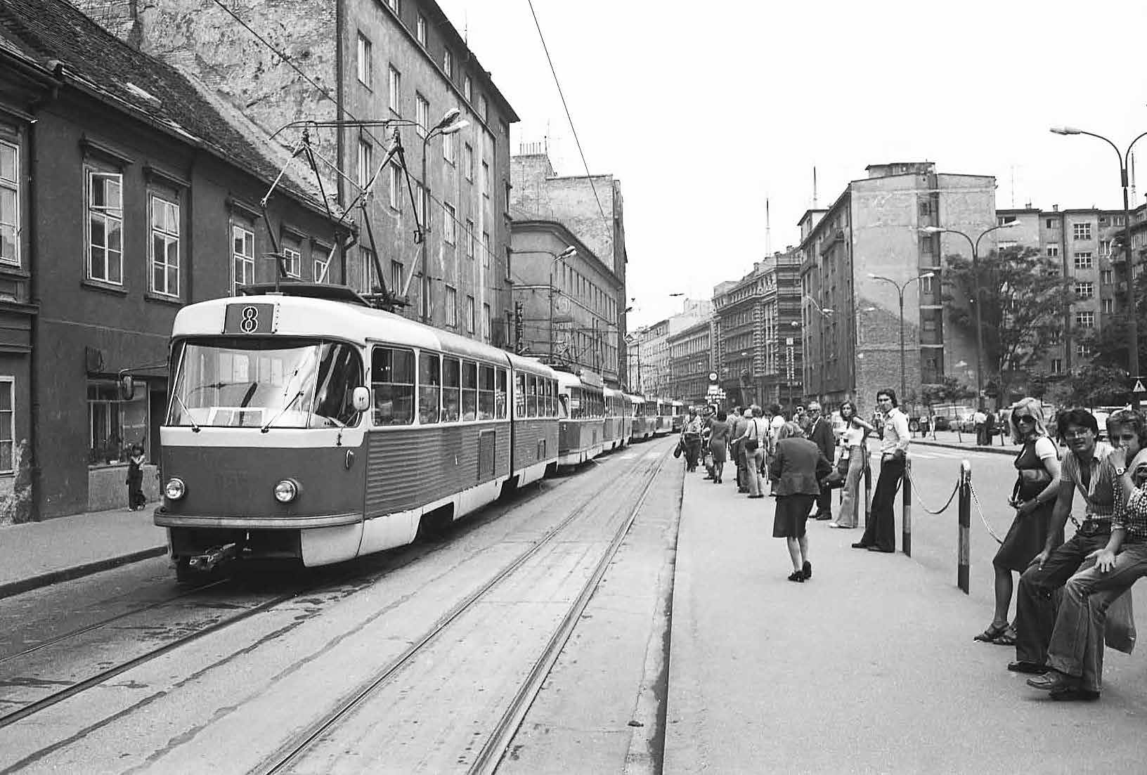 Bratislava, de Česk Armady is gevuld met veel trams dankzij een stroomstoring; 5 augustus 1977.